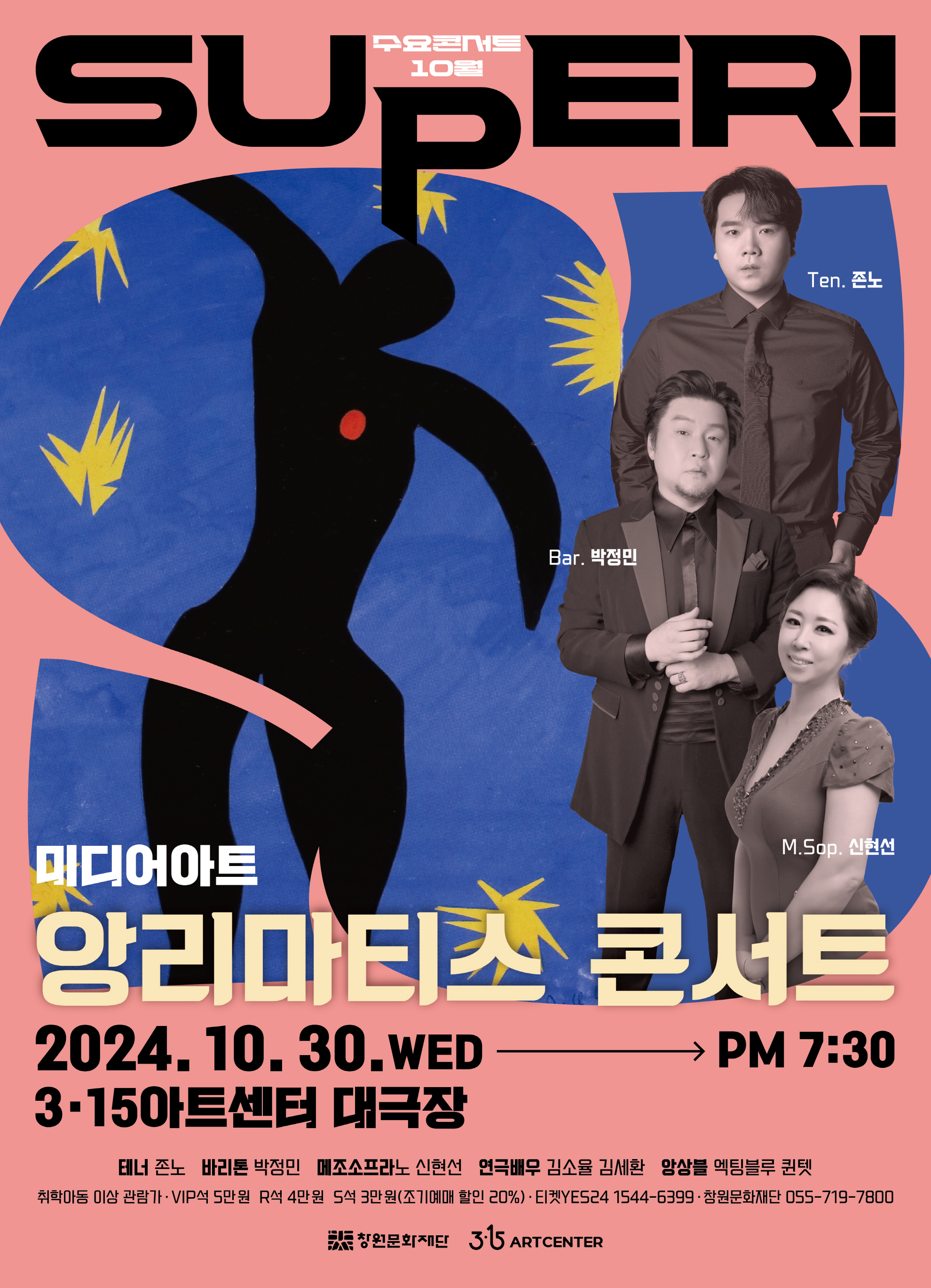 1. 공연개요 가. 공연명: SUPER! 수요콘서트 10월 『미디어아트 앙리마티스 콘서트』 나. 공연일시: 2024. 10. 30.(수) 오후 7시 30분 다. 공연장소: 3·15아트센터 대극장(창원특례시 마산회원구 삼호로 135) 라. 출연진: 테너 존노(라비던스), 메조소프라노 신현선, 바리톤 박정민, 베이스 김세환, 연극배우 김소율, 앙상블 액팅블루 퀸텟 마. 예매처: 창원문화재단, 티켓예스24, 네이버예약