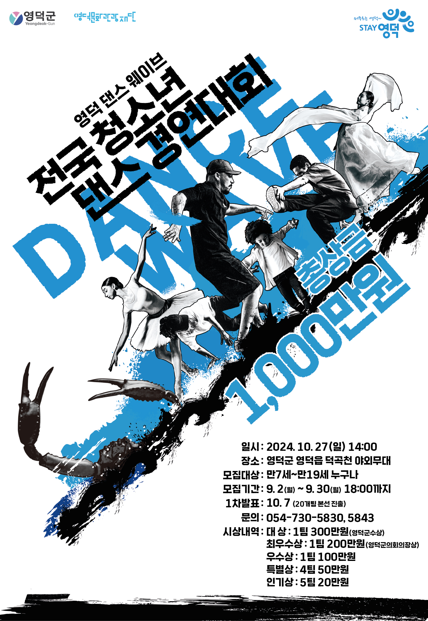 1. 행사개요 가. 대회명: 전국 청소년 댄스 경연대회<영덕 댄스웨이브> 나. 대회일시: 2024. 10. 27.(일) 14:00 다. 대회장소: 영덕군 영덕읍 덕곡천 야외무대 라. 참고: 영덕 댄스웨이브 포스터